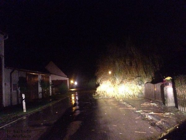 Baum lag zur hälfte auf der Fahrbahn und drückte auch gegen einen Oberflurhydranten.Alarmiert: Neukirchen/Hirschbronn und Sachsen b.A
