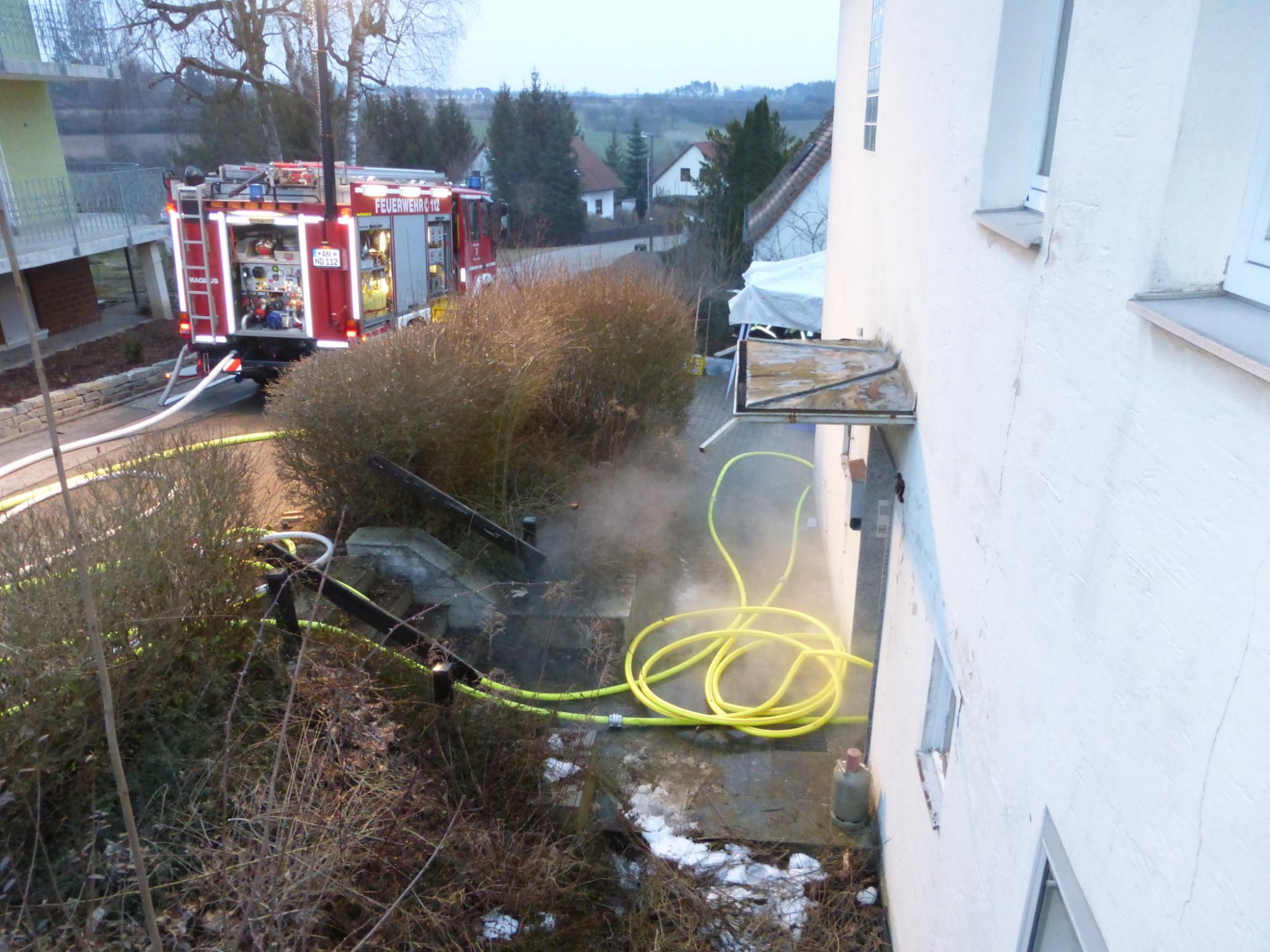 Gestern hatten wir die Möglichkeit in einem Abbruchhaus eine realitätsnahe Atemschutzübung durchzuführen. Das angenommene Szenario war ein Kellerbrand mit einer starken Rauchausbreitung in den beiden darüber befindlichen Wohnungen. Die Atemschutztrupps gingen zur Brandbekämpfung in den Keller vor und suchten parallel nach zwei, sich in den Wohnungen befindlichen, vermissten Personen. Da das Übungsobjekt bald abgerissen wird, konnten die Trupps mit Wasser am Rohr vorgehen und verschlossene Türen gewaltsam öffnen.
