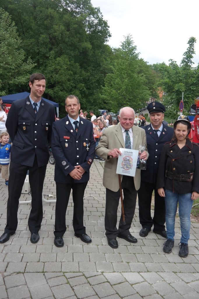 Anlässlich des großen Familiennachmittags der FFW Sachsen am 29.05. wurde durch den 1. Vorsitzenden, Martin Schuh, die Ehrung für 60 Jahre Mitgliedschaft in der Feuerwehr Sachsen für Herrn Fritz Schuh nachgeholt. Der 1. Vorsitzende bedankte sich bei Fritz Schuh für die jahrzehnte lange Treue zur Feuerwehr und überreichte eine Urkunde sowie ein Präsent. Ganz besonderer Dank galt Fritz Schuh für die Spende seiner über 60 Jahre alten, sorgsam aufbereiteten, Originaluniform mit Gurt und Lederhelm die künftig einen Ehrenplatz im Gerätehaus finden wird.