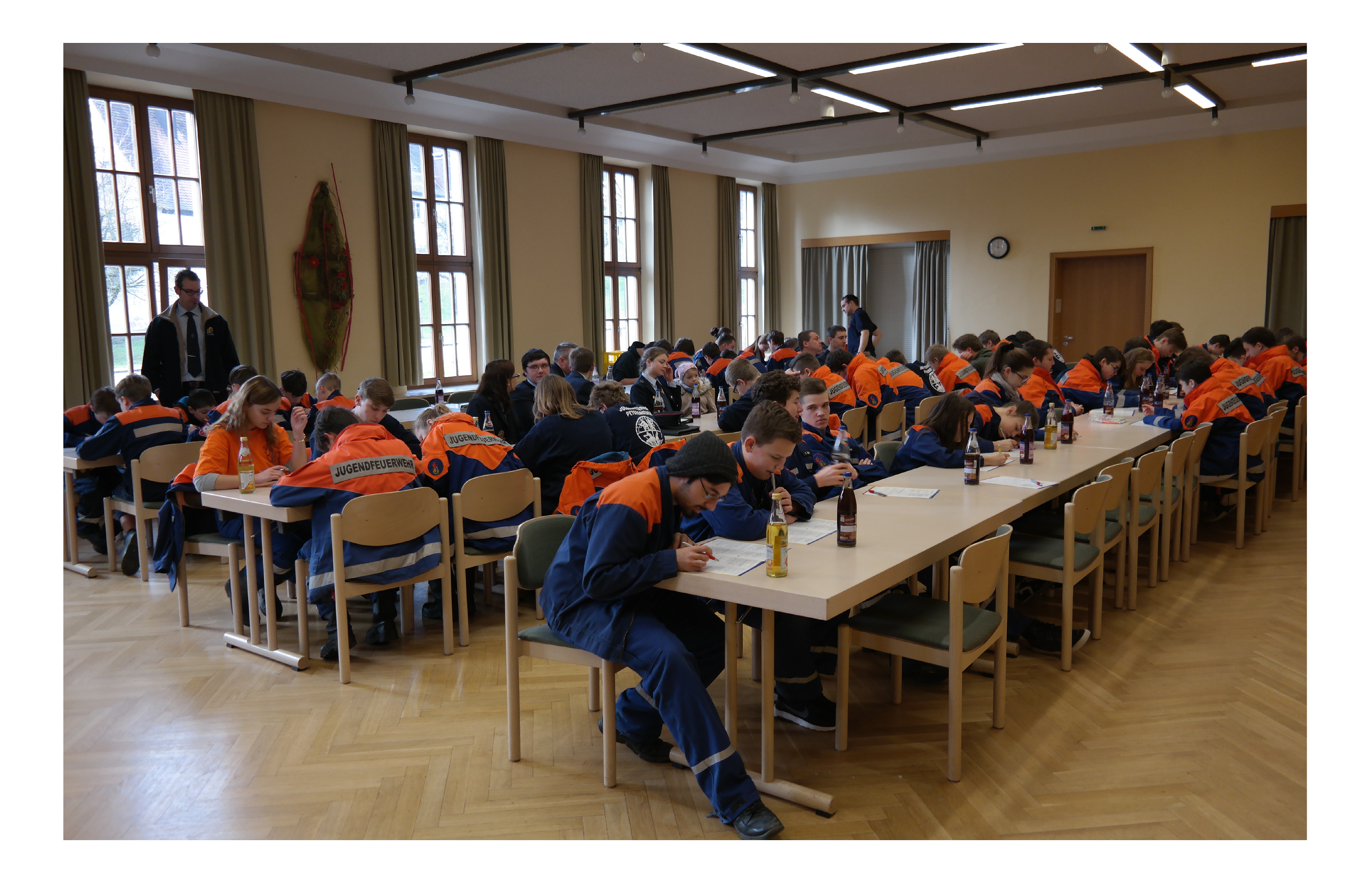 den Jugendwarten, sowie den Kreisjugendwart Bitter begrüßt. Anschließend erfolgte die Bearbeitung des theoretischen Wissenstests durch alle Anwesenden. Das Thema des diesjährigen Tests war „Unfallverhütung in der Jugendfeuerwehr – persönliche Schutzausrüstung und Dienstkleidung“. Danach ging es gruppenweise weiter zur Abnahme der praktischen Aufgaben. Hierfür mussten die Jugendlichen entweder die Schutzausrüstung in die jeweilige Altersstufe einsortieren oder Funktionsabzeichen den passenden Begriffen zuordnen. Für alle Jugendlichen, welche gerade nicht bei der Abnahme beschäftigt waren, wurden verschiedene Aktivitäten, wie z.B. „Kickern“ oder Filme angeboten. Ebenso hatte das Jugendzentrum Sachsen für den heutigen Tag extra geöffnet, damit sich die Jugendlichen dort ebenfalls aufhalten konnten.